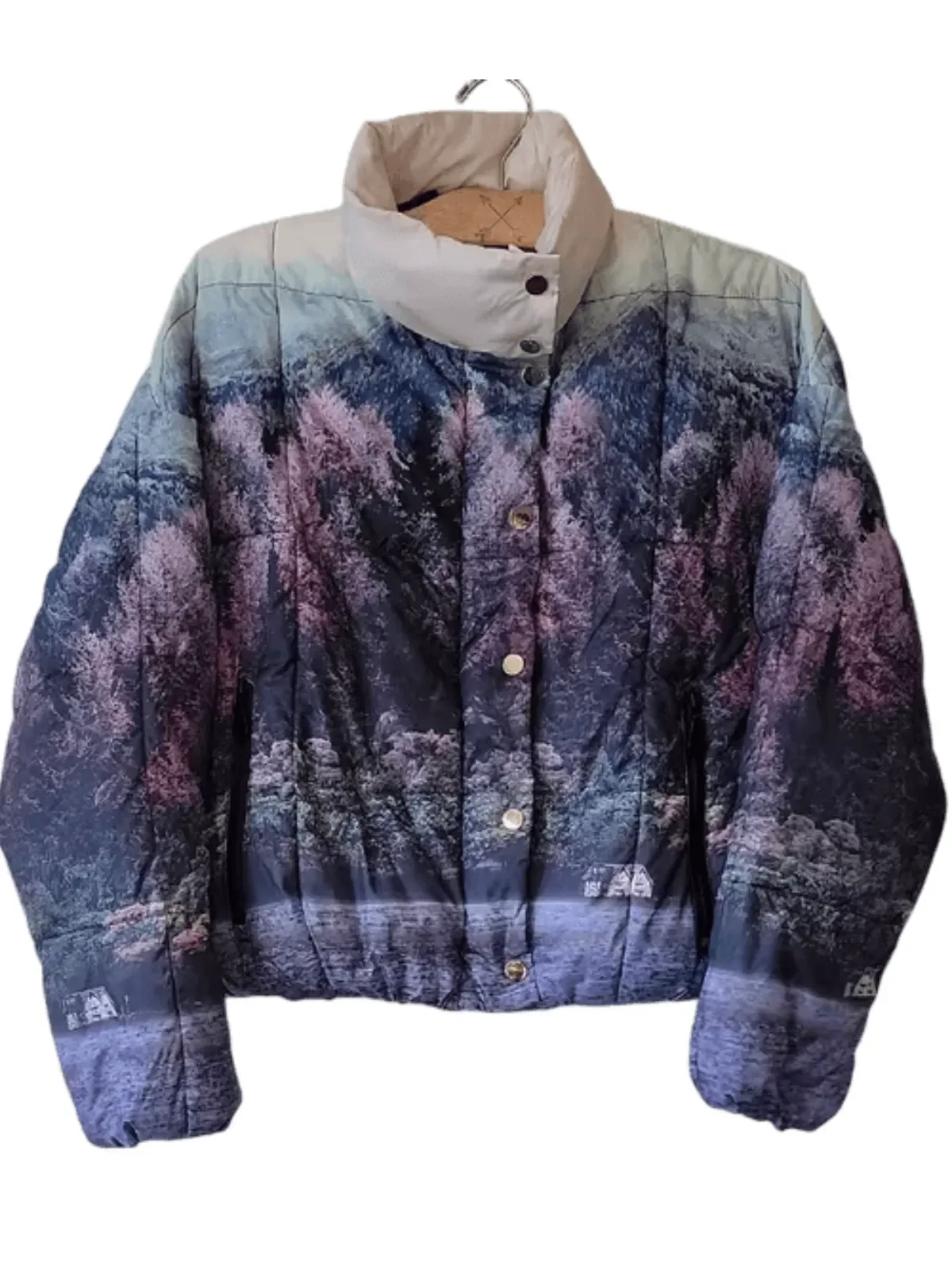 I don’t know exactly why this piece had such an effect on me. Possibly because it looked like something both from the future and something my grandma owned, which confused me. Or maybe because I had never seen realistic photo prints on clothing before. Prints, sure—graphics, patterns—but never a real-life photograph slapped onto something you could wear. It was a mixing of mediums I had truly never experienced. I looked down at the little table in front of me, and not only was the photograph printed onto a jacket, but also on a puffer scarf and maxi skirt.