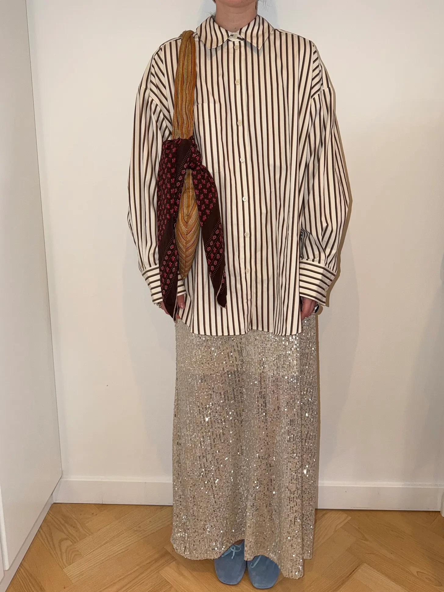 A column maxi skirt and oversized button down paring will never be a bad idea.