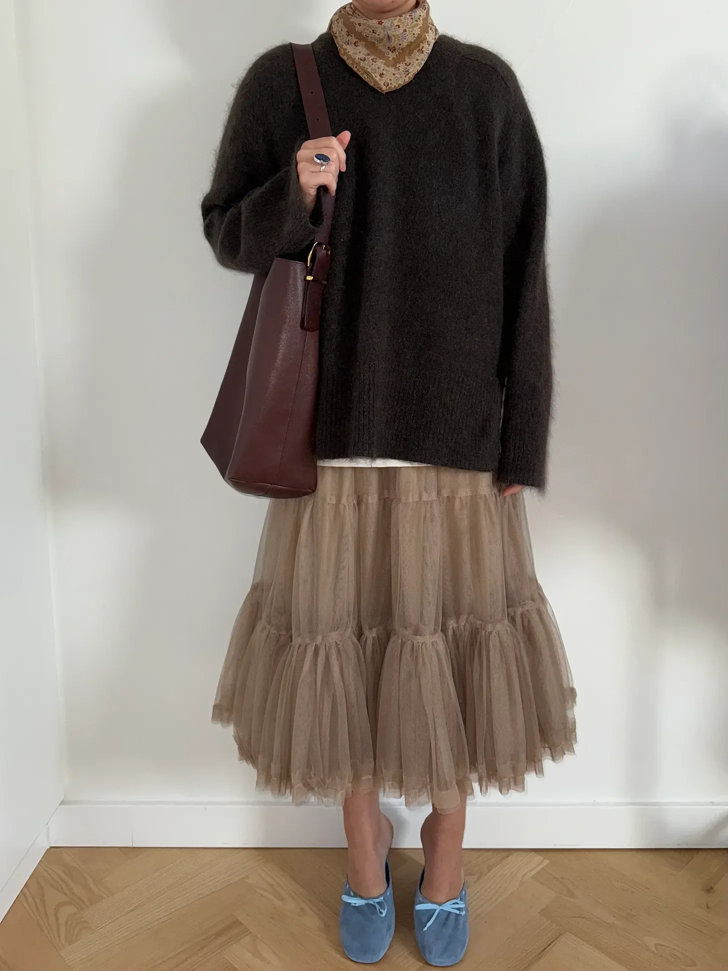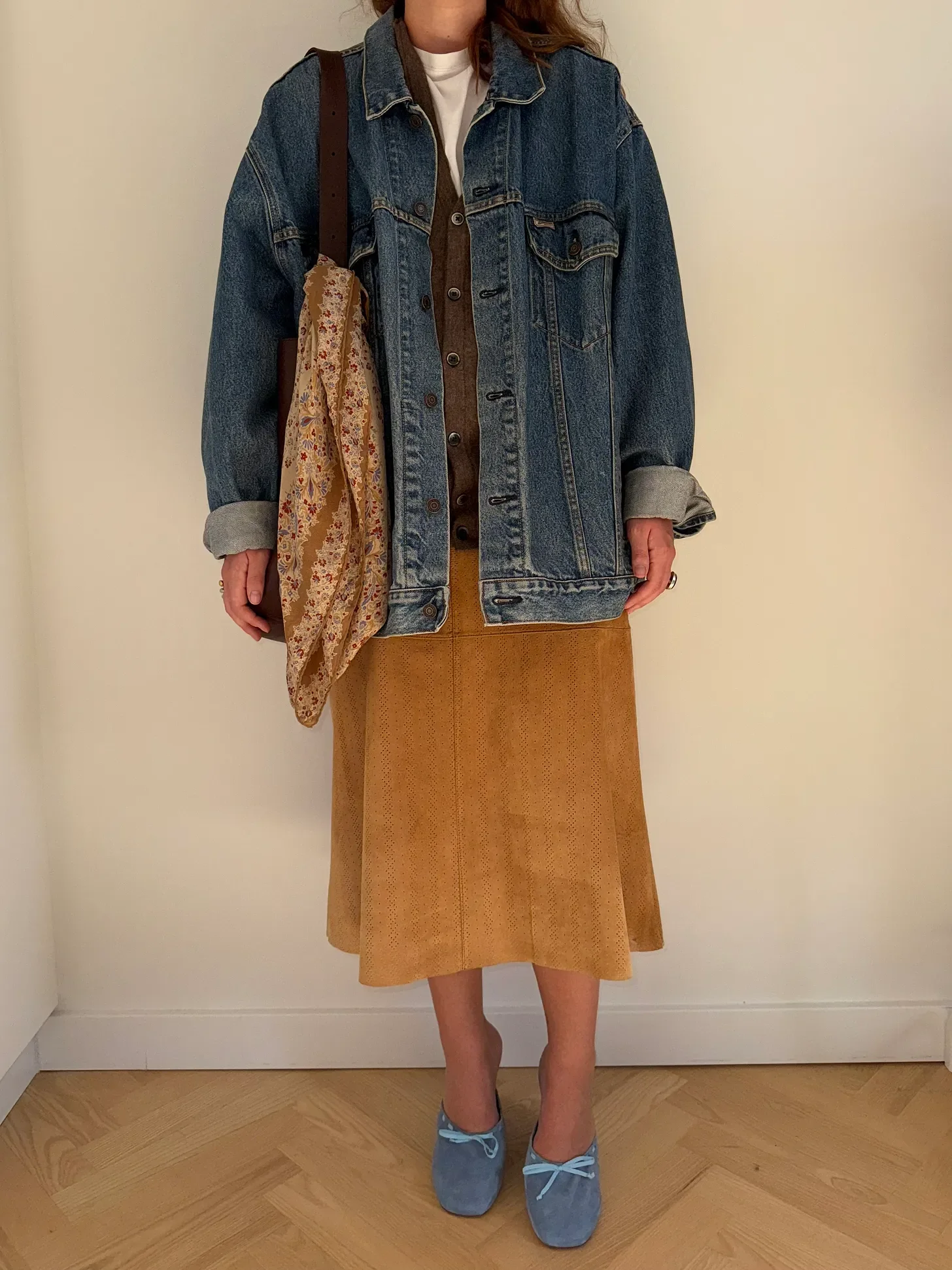 Now this is an outfit of true contrast. Suede appears twice, but not matching. Denim is stacked on top of cashmere. Silk is layered over leather. It’s both casual and intentional, oversized and fitted, formal and slouchy. This outfit belongs nowhere—and everywhere—all at once.