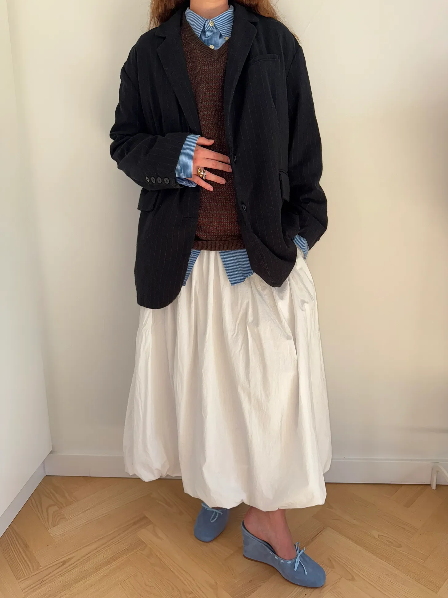 Another contrast I wanted to try was the idea of feminine versus academic. When I started building my next look, I was drawn to my favorite white bubble-hem maxi. It felt too similar in tone to the shoes, so I wanted to hit hard in the opposite direction. I began with the same button-up I had loved before, then added a little pattern mixing with a microscopic-patterned vest. For extra measure, I topped it off with a lightly pinstriped blazer.