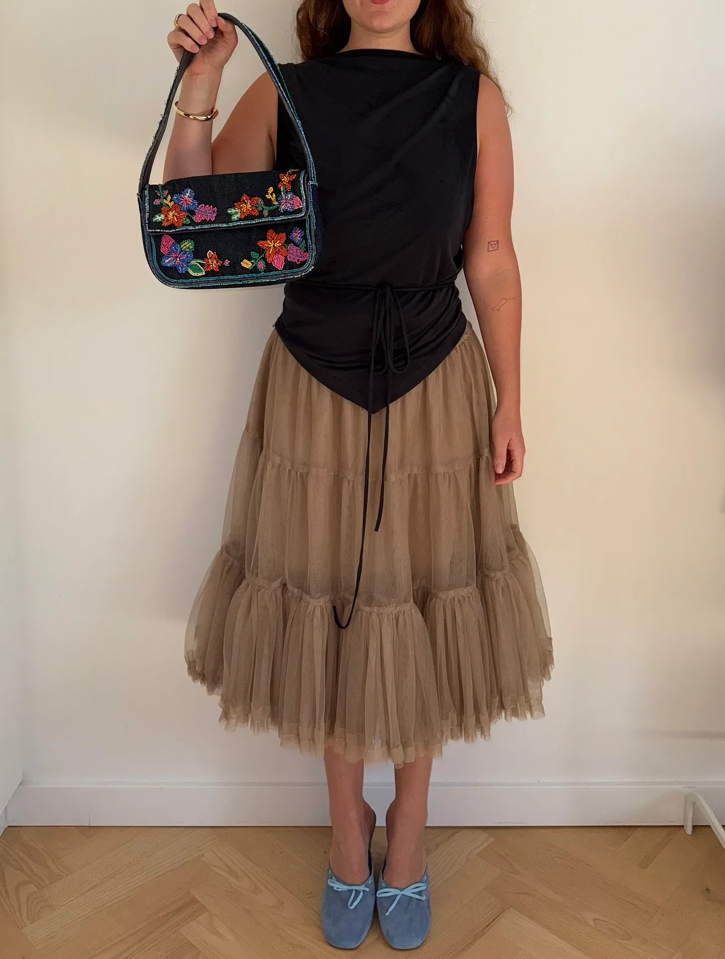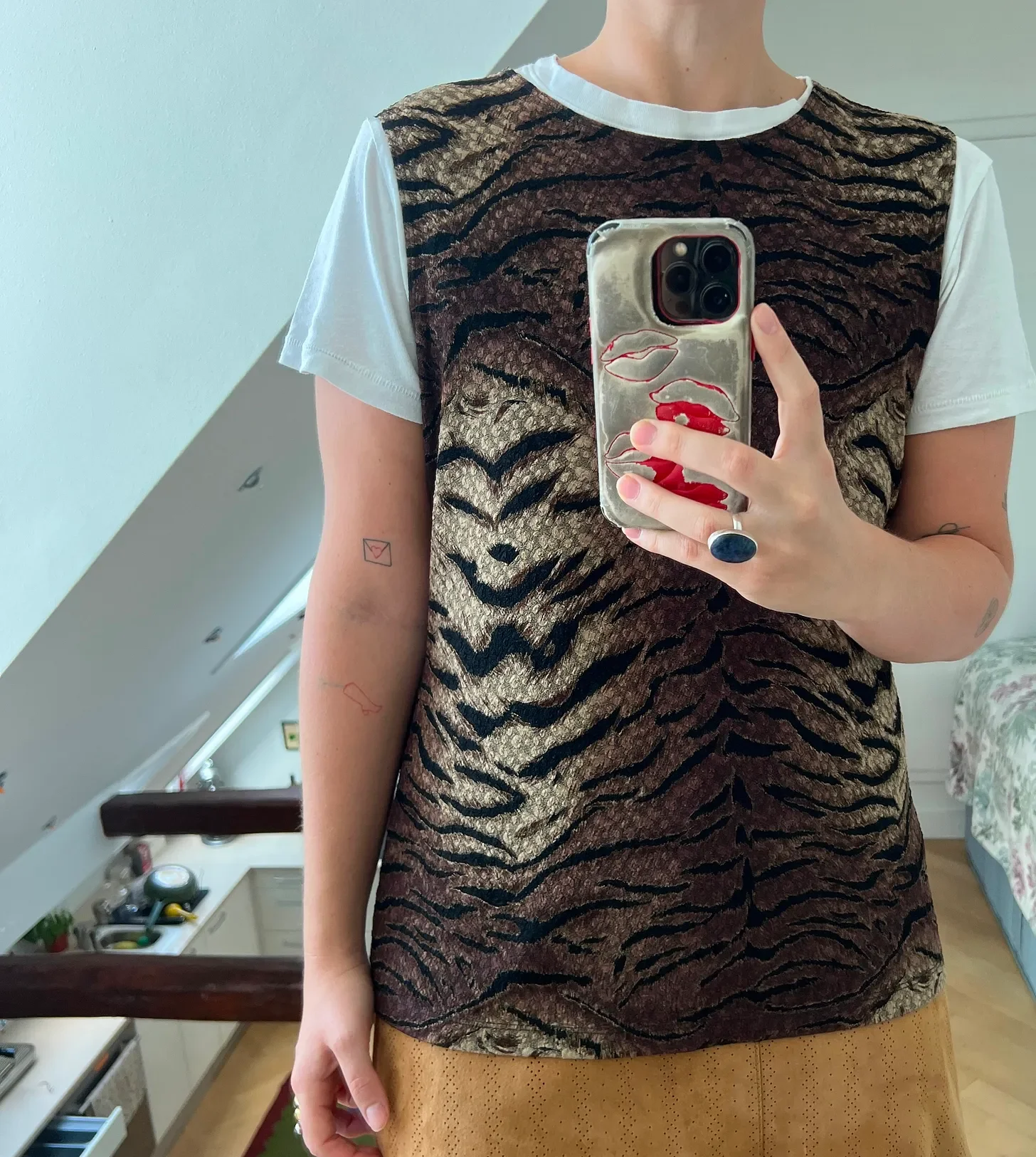 Another look that stood out to me came immediately after, when I shifted toward intensifying the Y2K essence of the piece. My vintage pink sequined skirt jumped out as an obvious choice, and shortly behind it, my nylon tiger-printed top. Anything that hangs a little low on the collarbone offers the opportunity to block in a fabric with an undershirt, add a little accessorizing, and voilà—we have an outfit.