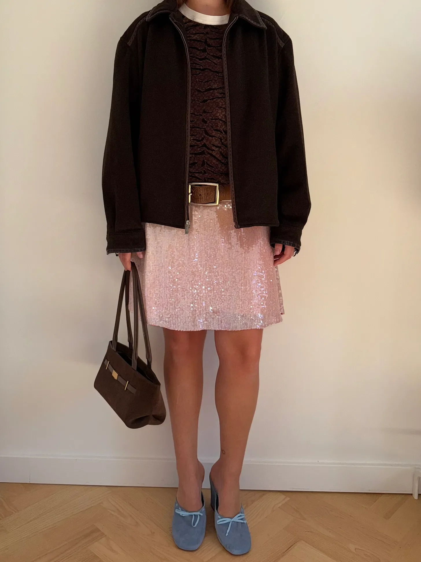 A slack-jawed button-up sitting above a textured or structured skirt has always been one of my favorite silhouettes. The casual, boyish wrinkling of the shirt overpowering a maximalist pink sequin number was one of my favorite combinations of the day. It struck the perfect balance between two very different feelings: relaxed and punchy. A hidden wooden necklace added an extra layer of texture, tying in with the warm-toned bag on my shoulder and completing the look.