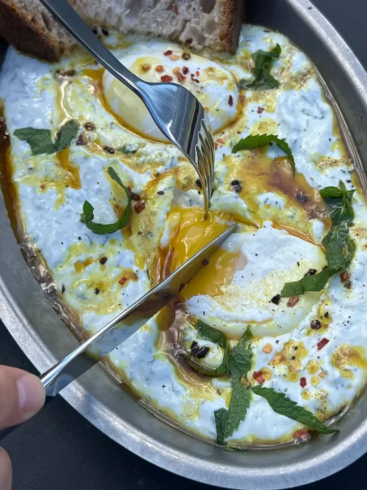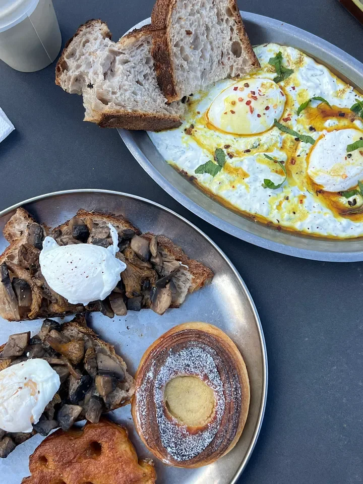 This week’s menu was poached eggs on mushroom toast, Turkish eggs with a spicy browned butter sauce on top, and pastries from the bakery downstairs.